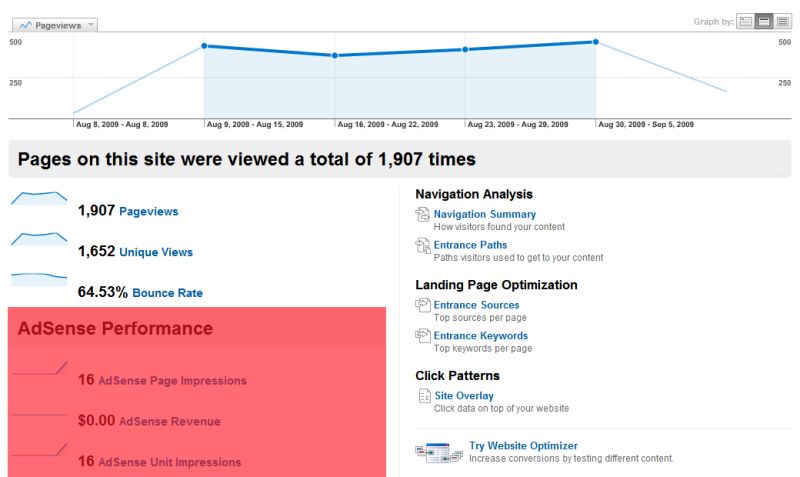 Google Analytics och AdSense är två separata tjänster som nu kan analyseras via samma verktyg (se röd ruta). Nu återstår bara att fo besökarna att klicka på annonserna så man får ihop till ett restaurangbesök med frugan åtminstone…tips någon ;-)