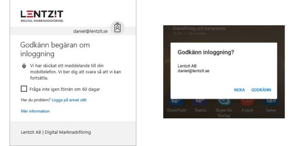 Bilden (nedan) till höger visar möjligheten att kunna vitlista autentiseringen i 60 dagar som är en funktion som kan aktiveras i Azure-portalen. Om du inte godkänner den aktuella förfrågan inom 60 sekunder ges du automatisk andra autentiseringsalternativ.