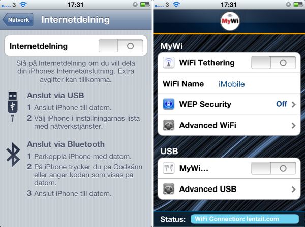 Du vet väl att din Android eller iPhone kan agera DataDongle (bredband via 3G), de flesta klarar det genom att ansluta en USB-kabel….i senaste versionen av Android finns det officiellt stöd för trådlös dataöverföring. Har du iPhone (3 eller4) har Apple tyvärr bestämt att man inte stödjer trådlös dataöverföring men det går att ordna genom att jailbreaka nallen och installera ett app som heter MyWi för knappa 100:a lappen.