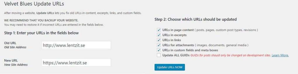 Med Velvet Blue´s lilla WP-tillägg kan du smidigt ersätta alla länkar i databasen till http-länkar. Var noga med att bocka i som det visas i steg 2!