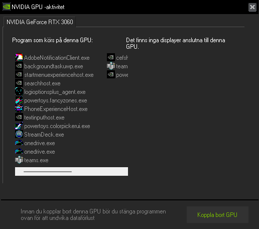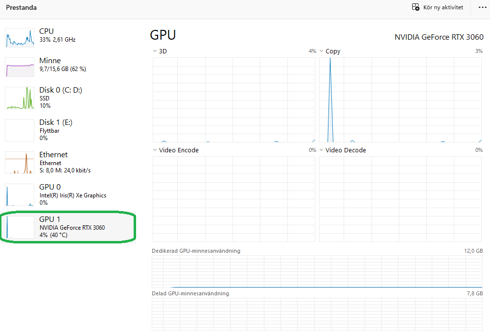 Min hårdvara är en 12:e Gen i7 1260P 16-kärning performance processor med 16GB DDR6 ram, SSD som klarar 6.6GB/sek med ett Intel IrisXE-grafikkort som är både snabb och energisnål men begränsar i form av grafiska prestanda so jag behöver för streaming och videoredigering. Windows har som standard högsta prioritet på att vara energisnål vilket gör att det externa krafikkortet prioriteras bort även om det är inkopplad. I Nvidias egna kontrollpanel kan man tvinga användningen av eGPU´s grafikkort som stamdard och därmed utnyttja det för alla applikationer som behöver det. (nedna bild)