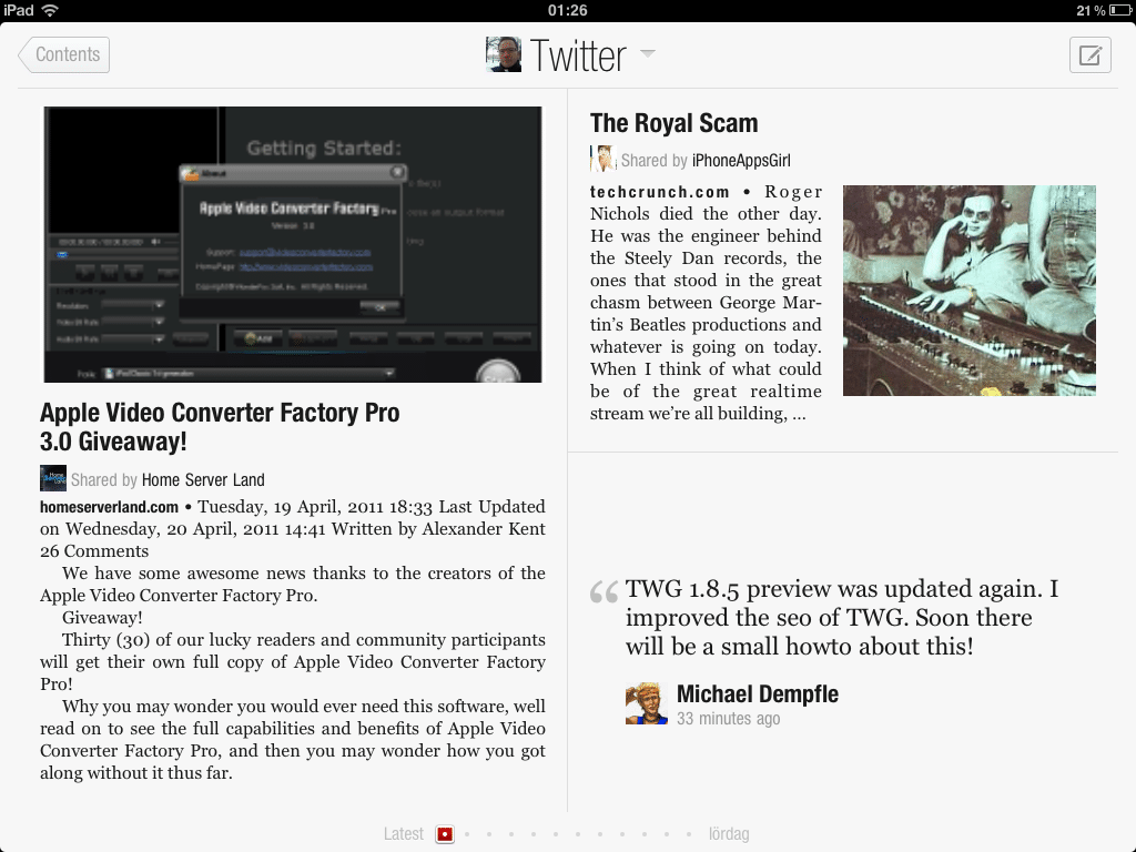 Nedan bild visar mitt twitter flöde i iPad appen Flipboard som ger bloggar och hemsidor med rss stöd ett helt nytt utseende som ger innehållet en ny dimension. Informationen sorteras snyggt i ”tidningsartiklar” som är ett beprövat format…precis som i vanliga tidningar händer det dock att bild och artikel inte hör ihop ;-)