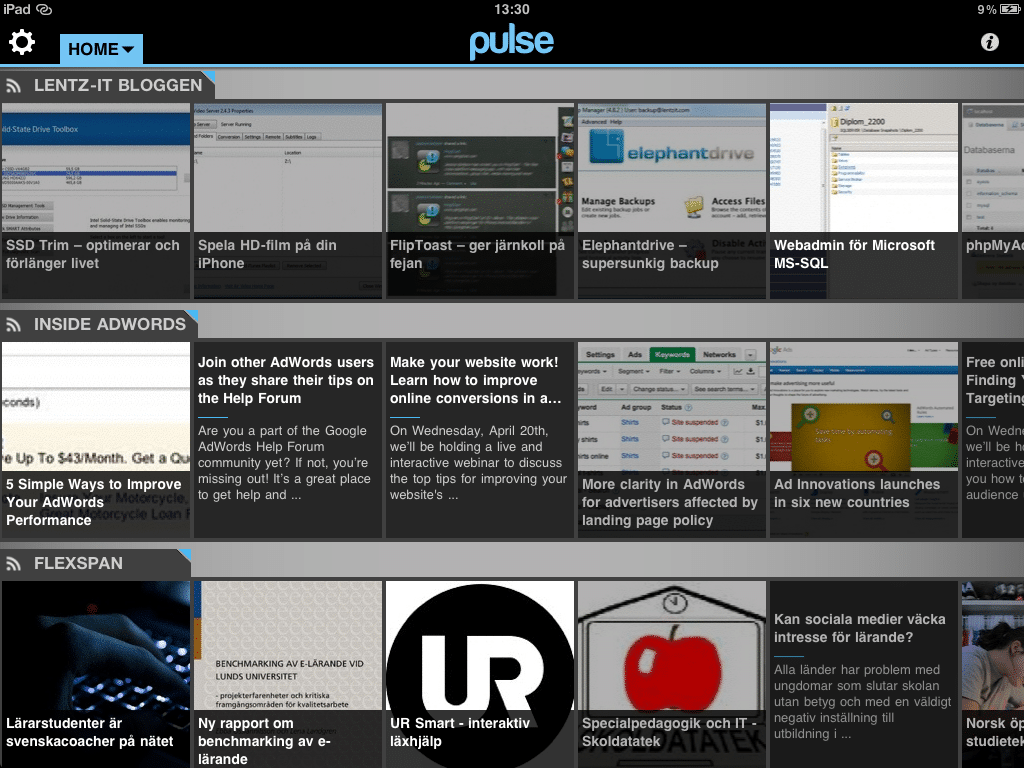 Ett annat program heter Pulse och finns till iPhone, iPad och Android (nedan bild). Helt OK grafisk men inte i närheten av Flipboard-upplevelsen.