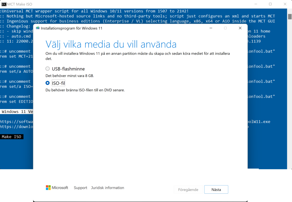 Nu väljer du om du vill skapa en sticka att starta ifrån eller en ISO-fil som du kan använda i t.ex. den virtuella miljön. Väljer du ISO-fil kan du efter skapandet bara dubbeklicka på filen för att starta uppgraderingen. Uppgraderingen är gratis och kommer att beakta din nuvarande licens (Home, Pro eller Enterprise)