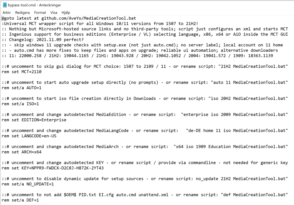 När du packat upp filen och öppnat upp den visas nedan innehål. Kopiera hela innehållet till en ny sida i notepad och spara den som xxxx.cmd (byt ut xxx mot vad du vill)