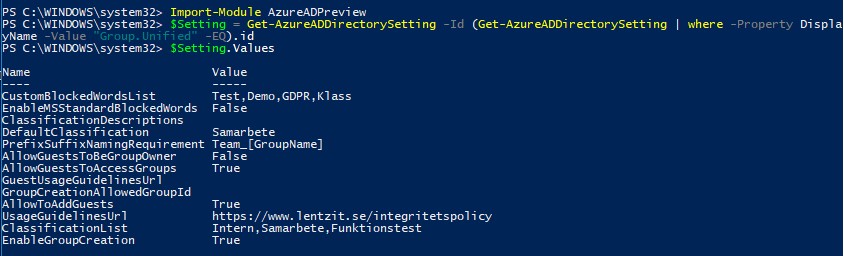$Setting = Get-AzureADDirectorySetting -Id (Get-AzureADDirectorySetting | where -Property DisplayName -Value "Group.Unified" -EQ).id
