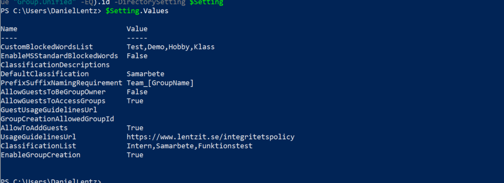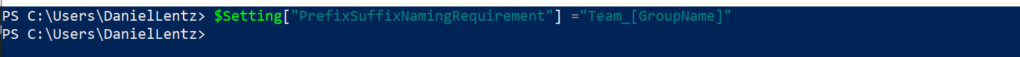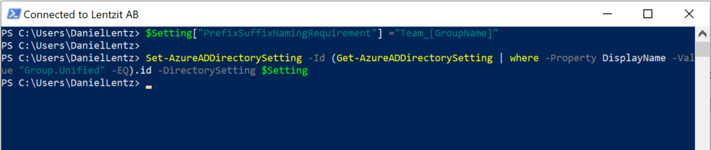 Set-AzureADDirectorySetting -Id (Get-AzureADDirectorySetting | where -Property DisplayName -Value "Group.Unified" -EQ).id -DirectorySetting $Setting