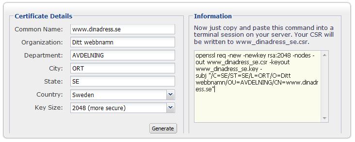 Enklaste sättet att ordna ett certifikat är med hjälp av en onlineleverantör som t.ex. Expert SSL. Nästan alla leverantörer har online guider för det vanligaste certifiktförfrågningar (nedan bild) men det krävs en hel del datorvana då det mesta sker med hjälp av kommandon utanför gränssnittet.