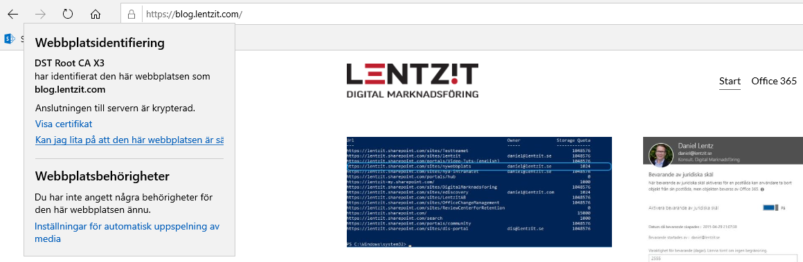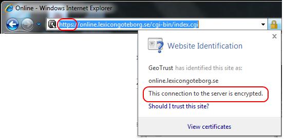 Du kan se om ett certifikat används direkt i adressfältet på din läsare, alla adresser som har krypterad information börjar på https://…t.ex. banker och online affärer där man kan handla med betalkort använder den typen av säkrad anslutning för att skydda dina uppgifter när du registrerar dig och ditt inköp. (nedan bild)