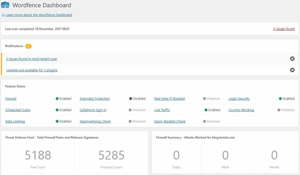 Med hjälp av Wordfence kan du nu skanna din installation på brister, övervaka och blockera tvivelaktigheter IP-adresser. Du blir också meddelad då det är dags att uppdatera tillägg och WordPress installationen. Kom dock ihåg att en uppdatering kan bryta funktioner som du har på sidan så var noga med att skapa säkerhetskopior.