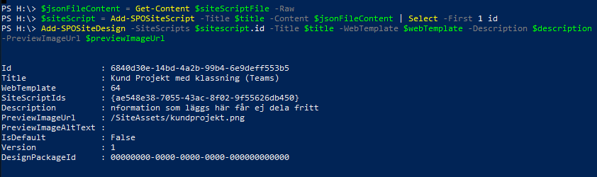 Add-SPOSiteDesign -SiteScripts $sitescript.id -Title $title -WebTemplate $webTemplate -Description $description -PreviewImageUrl $previewImageUrl