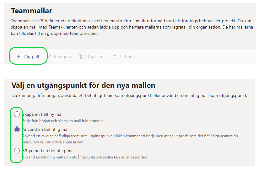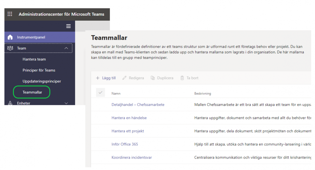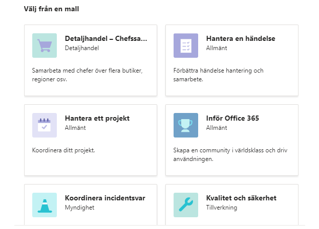 Dessa mallar i sin tur kan utökas till att innehålla mallar som du skapar själv. Du måste dock ha tillgång till Teams Admin Center