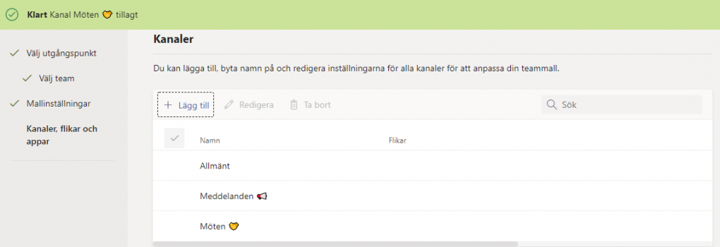 Nästa steg kan du skapa kanaler som skall finnas med från start (du kan inte skapa privata kanaler i mallen)