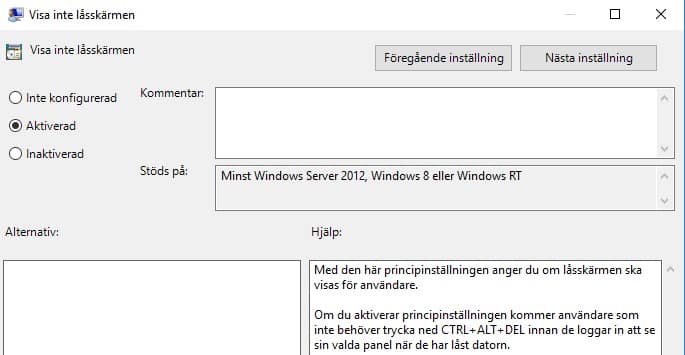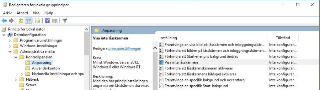 Datorkonfiguration / Administrativa mallar / Kontrollpanelen / Anpassning / Visa inte låsskärmen
