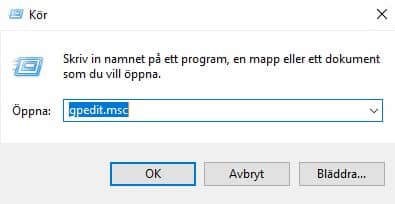 Högerklicka på startknappen och välj kör….skriv in ”gpedit.msc” och tryck enter…