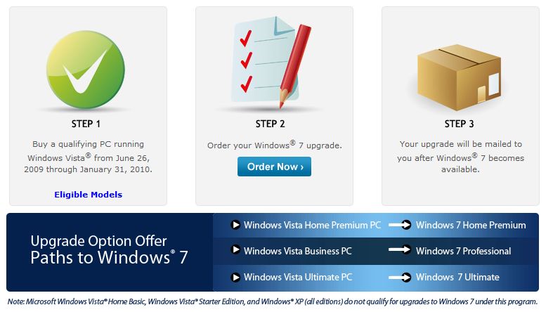 Windows 7 finns redan tillgänglig för nedladdning dock kommer det att dröja innan det går att köpa. Däremot finns det gott om datorer som har Vista förinstallerade som riskerar bli stående nu när 7:an är på G. För att förhindra just det så erbjuds alla som köper en dator (utvalda modeller och märken) med operativsystemet Vista en gratis uppgradering om köpet skett efter den 26:e Juli 2009 eller innan 31:e Januari 2010.