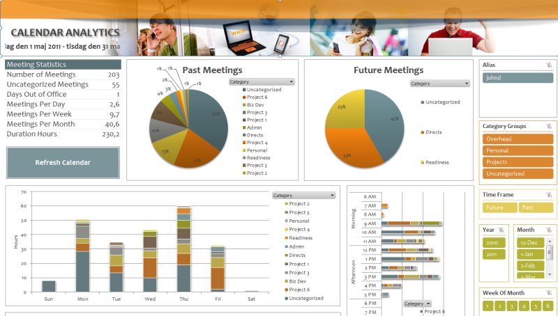 Om du har Exchange som kalenderverktyg har du tur, ett tillägg som heter Calendar Analytics Tool (gratis) ordnar en exceptionell översikt (ovan bild) av din tid så du kan se vad du lagt tid på…dett kräver så klart att du är ytterst noggran med att fylla i din kalender och att du använder kategorierna (för att få beskrivningar). För att börja analysera behöver du program både Power Pivot (gratis) och Excel 2010 (kräver licens) eller nyare.